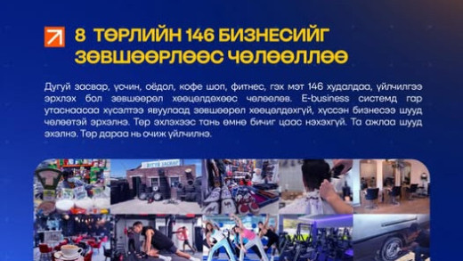 Та дугуй, засвар, үсчин, оёдол, кофе шоп, фитнес зэрэг 146 бизнес эрхлэхийг хүсвэл E-business системд гар утаснаасаа мэдэгдээд шууд эхлэх бо…