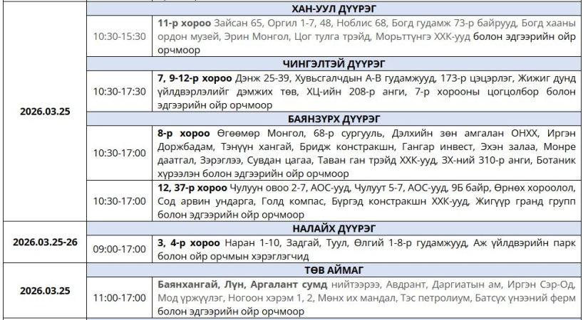 Цахилгаан эрчим хүчний найдвартай, тасралтгүй ажиллагааг хангах зорилгоор төлөвлөгөөт засвар үйлчилгээ хийхтэй холбогдуулан дараах байршилд түр хугацаанд цахилгааны хязгаарлалт хийнэ.