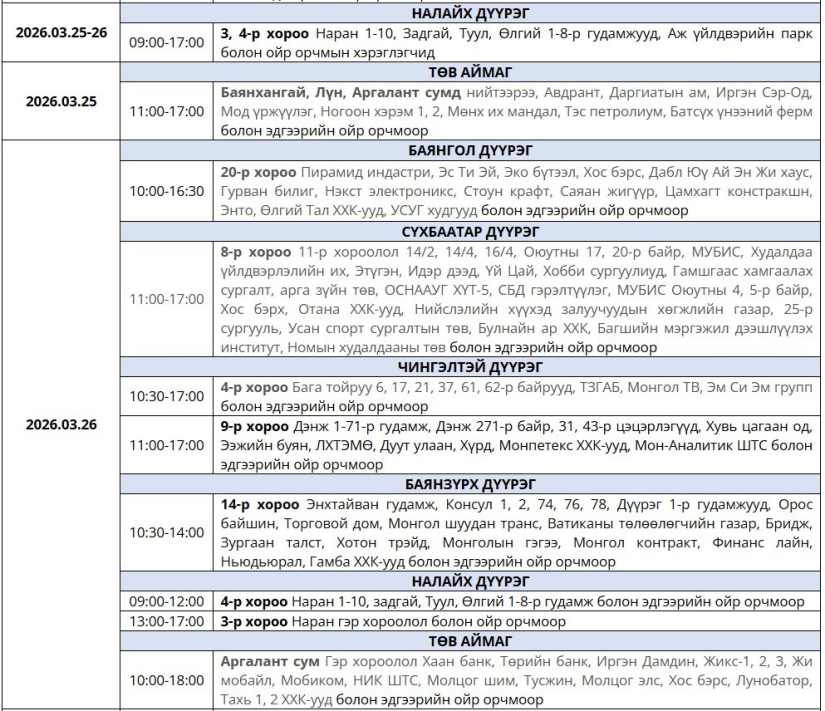 Цахилгаан эрчим хүчний найдвартай, тасралтгүй ажиллагааг хангах зорилгоор төлөвлөгөөт засвар үйлчилгээ хийхтэй холбогдуулан дараах байршилд түр хугацаанд цахилгааны хязгаарлалт хийнэ.