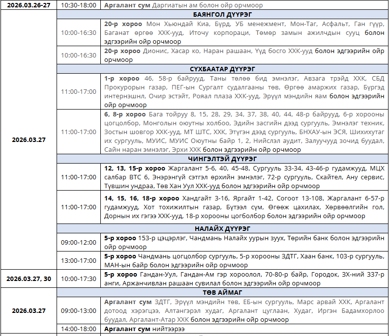 Улаанбаатар цахилгаан түгээх станц маргааш (2026.03.27) дараах байршилд цахилгаан хязгаарлана.  Нийт 12 байршил багтжээ. Төв  аймгийн Аргант суманд нийтээрээ цахилгаангүй болно гэв.